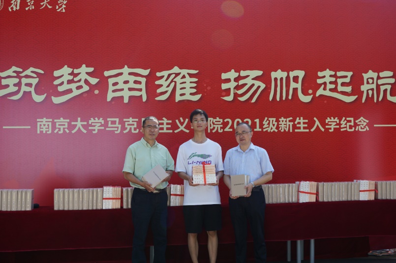 院长胡大平向本科新生们赠送书籍,并对新生们寄予深切的期许。各位新生也感受到了马院领导和老师们的关怀和期待。筑梦南雍,扬帆起航。