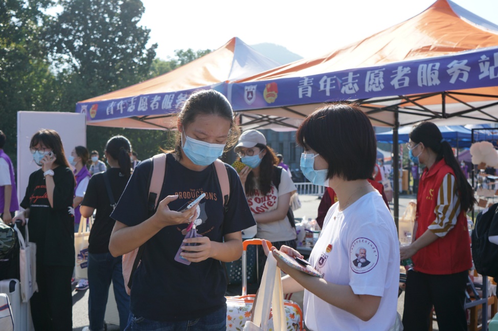 学院组织志愿者担任本科新生报到联系人,保障新生安全报到、高效入学。志愿者们提前联络新生,做到全流程陪伴新生入学,并通过制作文创展板、文化贴等为新生呈现马院的文化氛围。新生们拿好通知书备齐材料,打开苏康码、行程码,经过核对后开启期待已久的南大校园生活。马院志愿者们在岗迎新,热情服务各位新生。