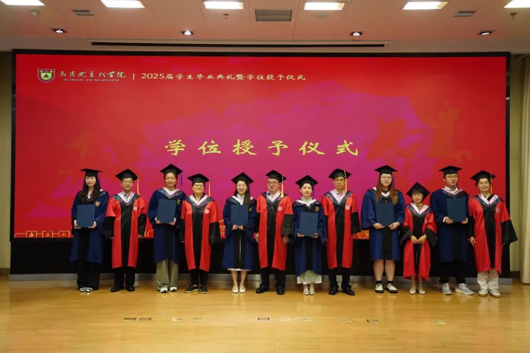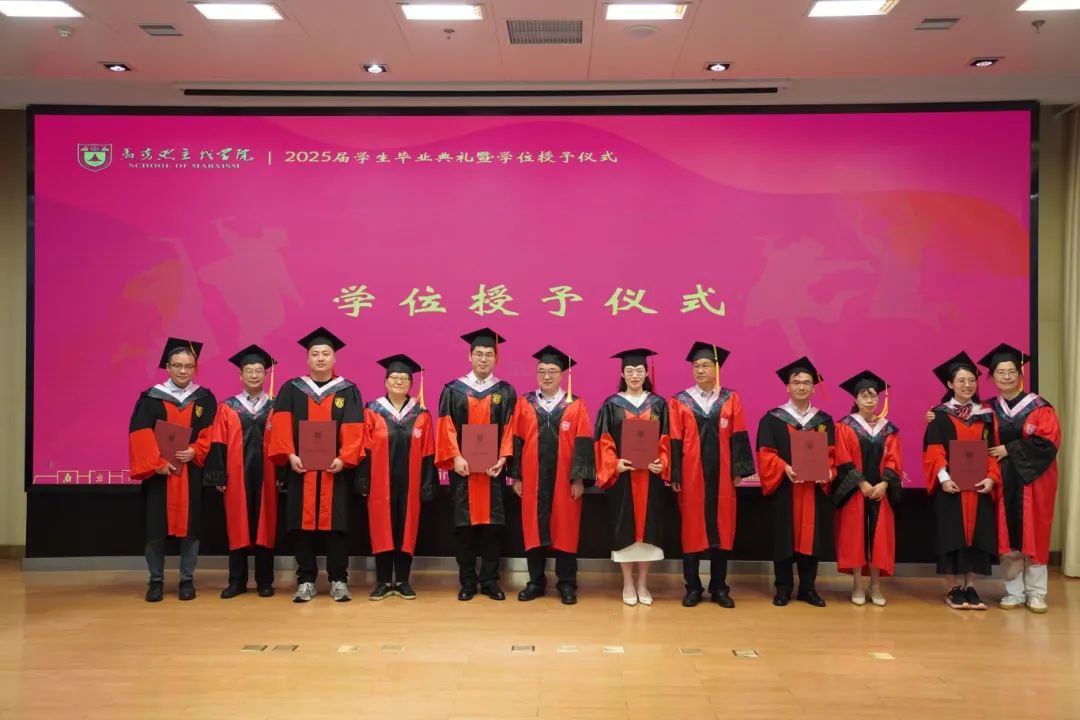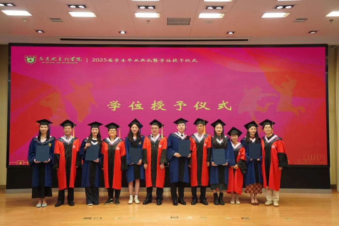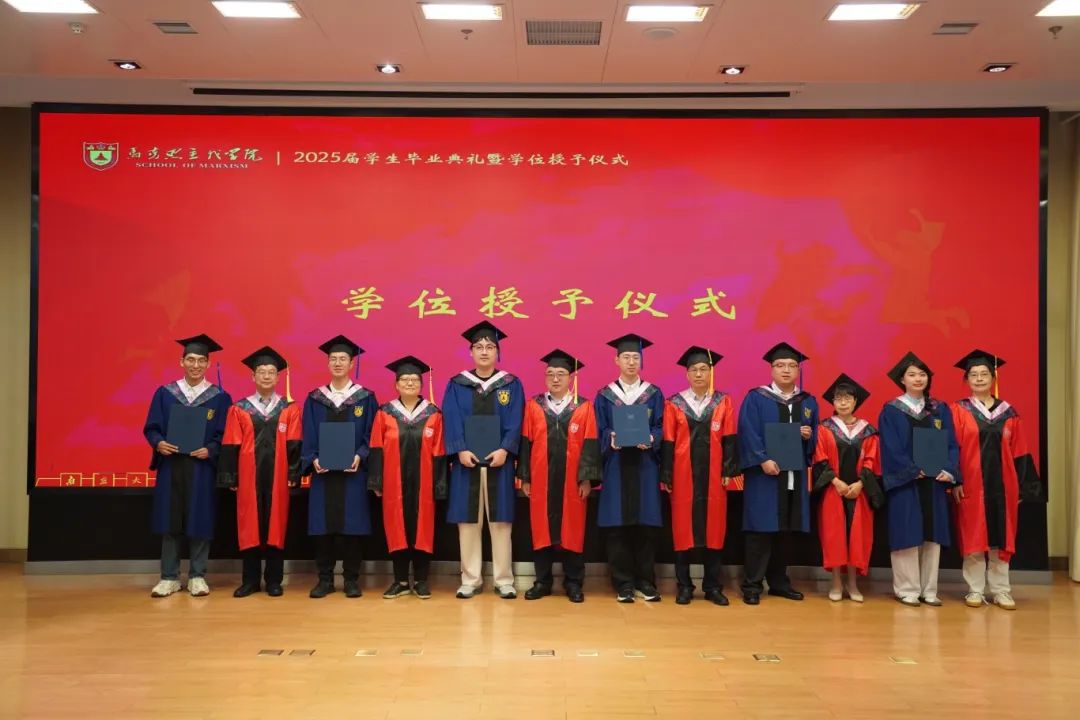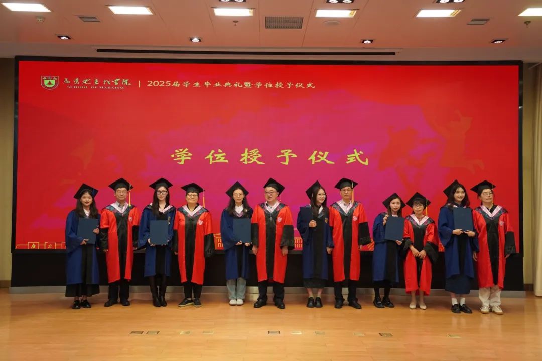 马克思主义学院2025届学生毕业典礼暨学位授予仪式在杜厦图书馆报告厅成功举办。学院党委书记时昱老师、院长王建华老师,副院长吴翠丽老师、倪春纳老师、李乾坤老师,学院学位评定分委员会委员王明生老师、戴雪红老师、熊秋良老师、暴庆刚老师,青年教师代表王楠老师、周瑞瑞老师,辅导员刘晶月老师出席典礼。典礼由学院党委副书记夏娟老师主持。