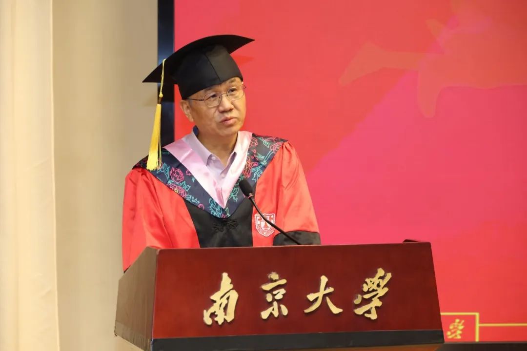 博士毕业生代表范佛山同学则用“感想”“感谢”“感悟”三个关键词,回顾了七年南大时光。在谈及感想时,他回忆了可敬师长的托举、可喜的学院发展与可爱的南马学子;在表达感谢时,他感谢恩师王建华教授的学业指导与生活关怀,感谢同窗陪伴与家人支持。最后,范佛山分享自己的感悟。他认为,立志当立长志,并终其一生为之奋斗;在前行的道路上,既要以“静”积蓄力量,也要以“争”争取价值;而面对离别,则应将不舍化作动力,以进步酬报这段难忘的时光。