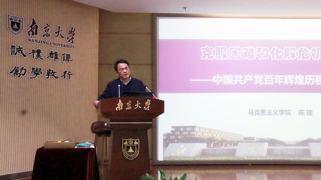 陈建老师以《克服困难和化解危机的密钥——中国共产党百年辉煌历程的经验总结》为主题,从人民、国家、民族等三个层面简要回顾了中国共产党在革命年代、建设时期、改革开放以来和中国特色社会主义新时代等不同时期带领中国人民取得的辉煌成就,让同学们明白学习百年党史不仅是为了总结过去,更是为了以史为鉴、把握现在、展望未来。随后,陈老师以时间为经、重大事件为纬,深入浅出地总结了中国共产党在百年历程中不断克服困难和化解危机的“六大密钥”,即追求民族复兴的伟大愿望、以人民为中心的先进思想、党内宝贵的杰出人物、对马克思主义的坚持与运用、勇于突破创新以及党的自我革命。
