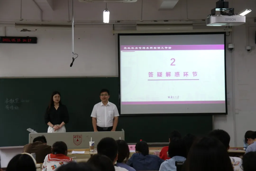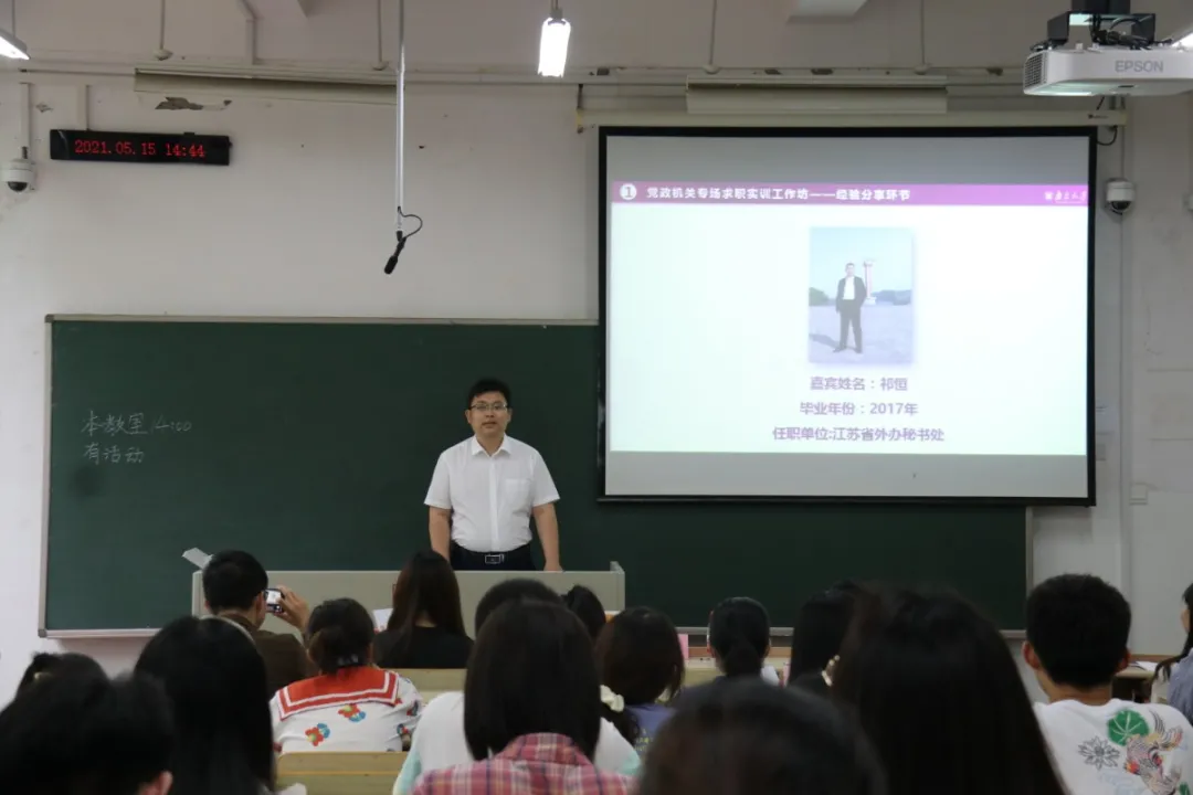 就职于党政机关的两位优秀毕业生——祁恒学长、黄雨蓓学姐对同学们进行求职实训的经验分享与无领导小组面试指导。活动由院研会实践部徐金婷同学主持。