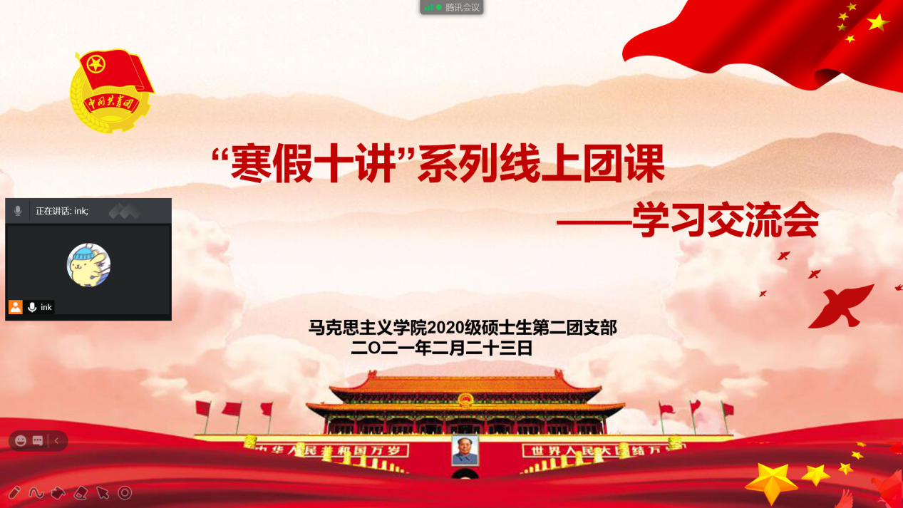 研究生第一、第二团支部通过微信群进行线上学习交流,支部团员撰写心得体会并进行分享。2020级硕士生第一团支部、第二团支部,2020级博士生团支部通过腾讯会议平台开展学生团员“寒假十课”学习交流会,支部成员结合生活实际、影视作品和家乡故事等内容,回顾“寒假十课”,分享学习心得体会。