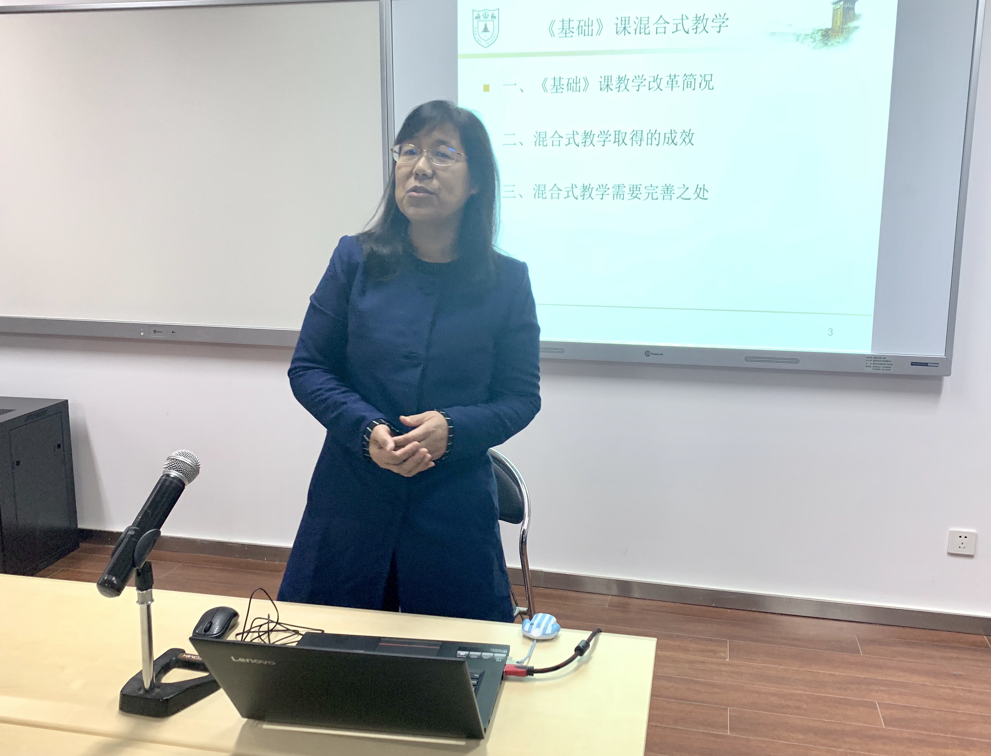学院教师代表就自己的教学经历详谈相关课程的教学及改革经验。沈伯平教授以“混合教学模式在高校思政课中的运用实践与体会”为主题,展现混合教学模式在《毛泽东思想与中国特色社会主义理论体系概论》课程中的现实运用。王锁明教授以“马克思主义发展思想”为例,结合教学案例,从因材施教、形散而神不散、化抽象为具象、思想教育意义四个方面畅谈教学体会。李喜英教授就《思想道德修养与法律基础》课程的混合式教学分享了自己的教学经验,同时指出,教师队伍建设需要扬长避短,翻转课堂本身的内容以及评分政策有待继续更新与细化,实践教学模式需进一步探索。