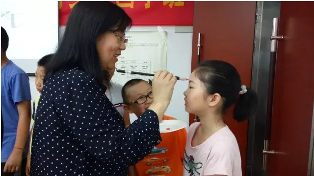 接下来是“朱砂启智”, 随着音乐响起,各位老师手托朱砂盘,轻执毛笔在同学们额头正中点上红痣,祝福学生们从此眼亮心明,开启人生的智慧之门。