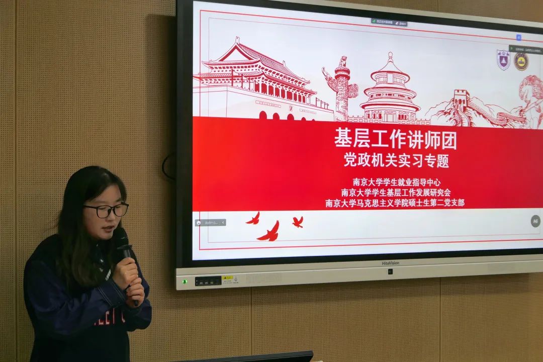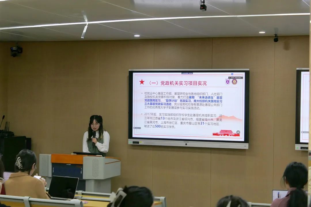 首先,由姜兴黔同学进行暑期党政机关实习项目介绍。校就业中心基层工作部、基层研究会与各地组织部门、人社部门及成人导航