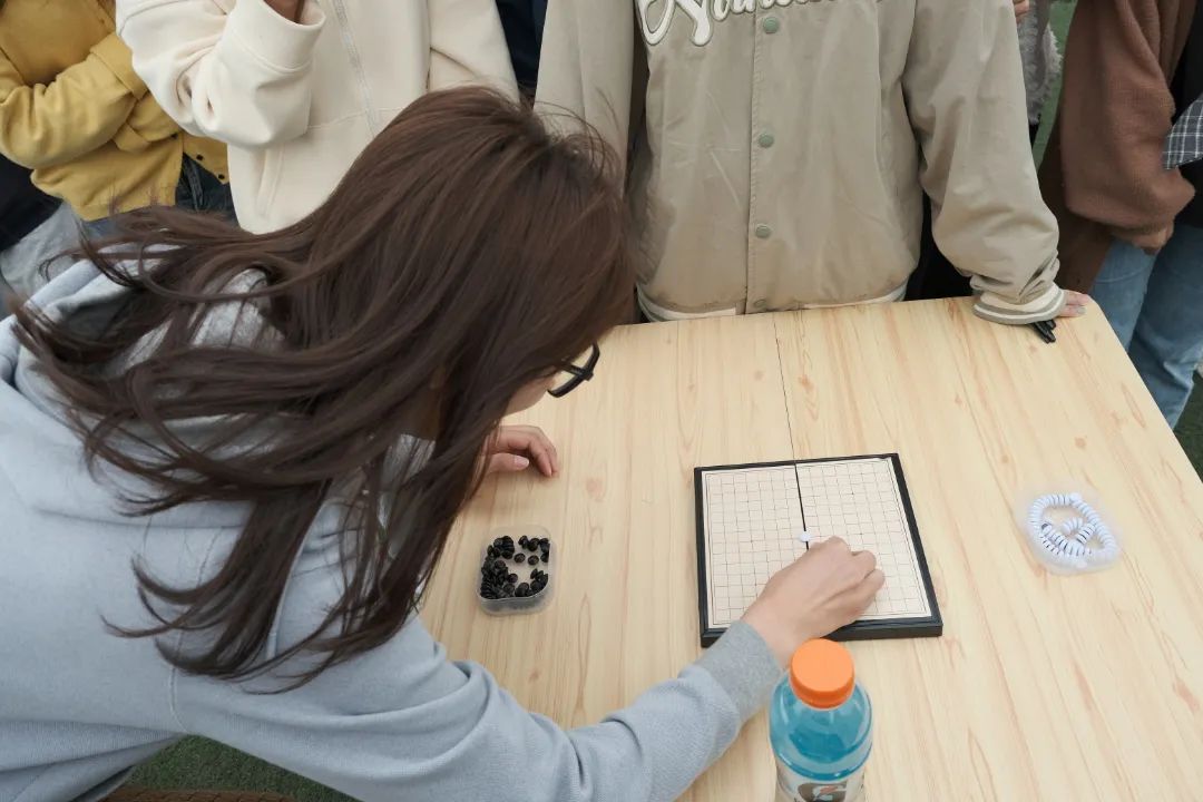 快乐的时间总是如此短暂,比赛来到一决胜负的最后一个项目——智慧接力五子棋。这个项目顾名思义,是对智力与体力的双重考验。与普通的五子棋比赛不同,这次比赛要求参赛选手在转圈和奔跑后才能进行落子,还需返回与队友进行击掌接力。作为压台项目,同学们纷纷聚集在棋桌旁围观、加油、指点,期待着见证最后的胜利者产生。最终,2021级硕士一班经过3轮比赛夺得了胜利。