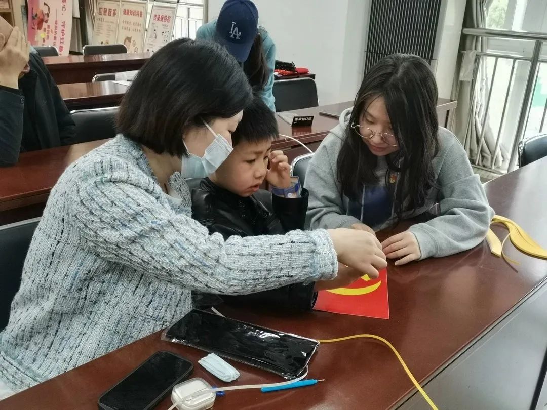 在“衍纸制党徽”环节中,郭建琪先为亲子家庭详细讲解了中国共产党党徽的构成部分及其象征,纠正了部分小朋友和家长对党徽的认知误区。接着,志愿者带领亲子家庭利用衍纸艺术制作“党徽”衍纸画。小朋友和家长将党徽的轮廓制作出来后,拿着工具卷金黄色纸条,通过卷曲、捏压、粘贴等步骤,亲子家庭创作出一个个生动形象的党徽衍纸作品。