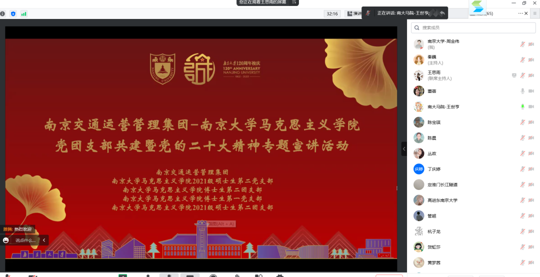 2021级硕士生第二党支部、博士生第一党支部、博士生第二团支部、2021级硕士生第二团支部与南京交通运营管理集团(以下简称:运管集团)以线上形式开展了党团支部共建暨党的二十大精神专题宣讲活动,双方单位60余名党团员青年相聚云端参加本次活动。活动分共建合作和专题宣讲两个环节,分别由运管集团党群工作部主任、团总支书记董蓓和 成人导航