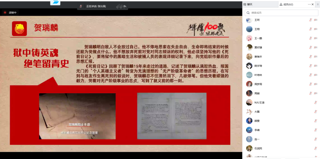 硕士研究生、青年宣讲团成员张沁园同学带来《南京青年团和雨花英烈精神》的主题宣讲。她以南京青年团史为主线,借助丰富的图文史料,声情并茂地讲述了雨花英烈贺瑞麟烈士的革命英雄事迹,展现了南京青年团组织在敌人封锁压迫中发展壮大的不朽历程,彰显了“两高一大”的雨花英烈精神,突出了在新时代新征程坚定历史自信、增强历史主动的重要意义。