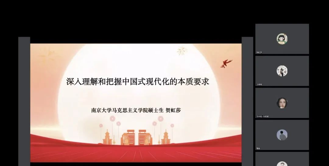 硕士研究生、青年宣讲团成员贺虹莎同学带来《深入理解和把握中国式现代化的本质要求》的主题宣讲。她从“中国式现代化是中国共产党领导的社会主义现代化”“中国式现代化的本质要求和中国特色的内在联系”“推进中国式现代化的重大原则”三个维度,对中国式现代化问题进行了系统全面的讲解,提出以中国式现代化全面推进中华民族伟大复兴是我们党的中心任务,党团员青年都应当在前进道路上找准自身定位、矢志砥砺奋斗,为实现远大目标贡献青春力量。