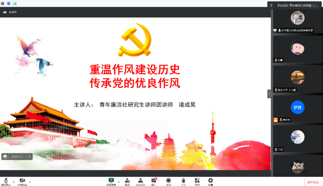 青年廉洁社研究生讲师团讲师诸成昊同学作“重温作风建设历史,传承党的优良作风”主题宣讲。他从延安整风运动说起,通过建国初期党领导的作风建设运动、党的作风建设历史的生动内涵、新时代作风建设的启示三个板块为大家梳理了党的作风建设的历史经验与现实。以建国初期的五次作风建设运动为线索,通过讲述毛泽东与黄炎培的“窑洞对”和西柏坡会议“两个务必”精神等生动内涵,使同志们认识到我们党的作风建设作为一项伟大工程对于党的建设的重要意义。最后,诸成昊同学总结了新时代作风建设的四点启示:把握作风建设的宝贵经验、传承理论联系实际的作风、密切联系人民群众的作风、积极开展自我批评的作风。历史启示我们,只有不忘初心,牢记来时路,才能理清思想之迷雾,不断提高坚持发展中国特色社会主义的能力。