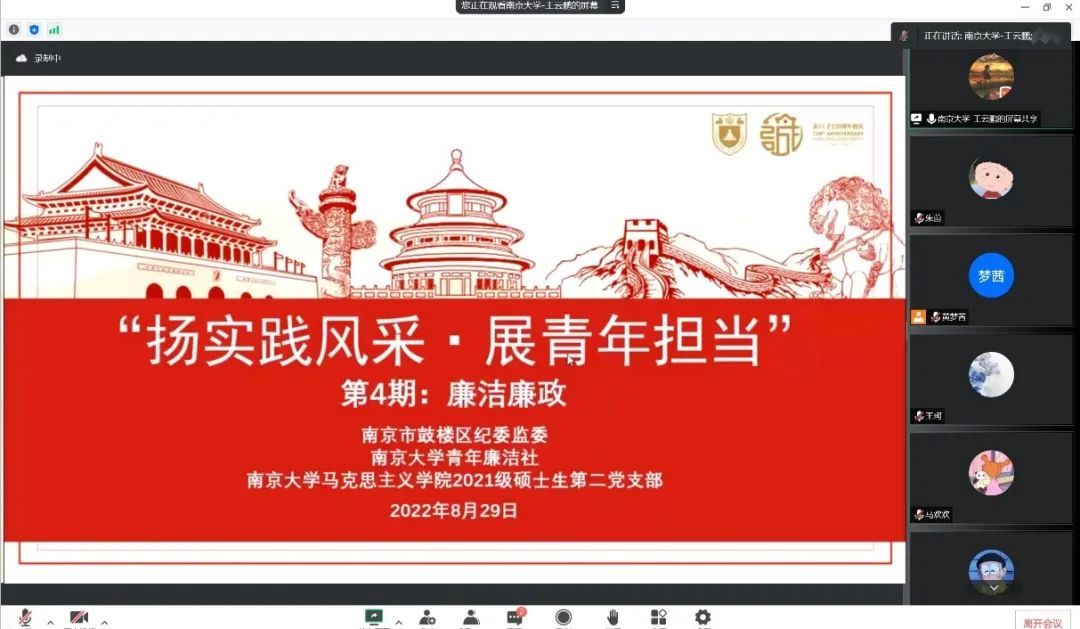 青年廉洁社联合开展“扬实践风采,展青年担当——2021级硕士研究生第二党支部暑期主题党日活动第4期‘廉洁廉政’实践风采展示。”会议由2021级硕士生第二党支部成员王云鹏同志主持。