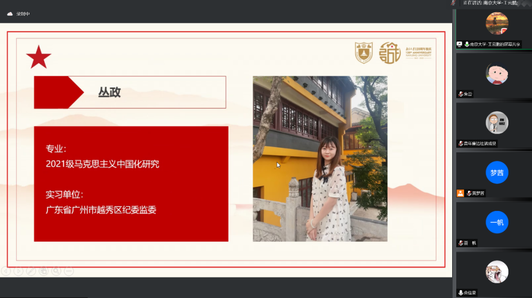 2021级硕士生第二党团支部党员进行暑期社会实践第4期汇报展示。本次汇报的党员是第五组的三位同志,他们利用假期时间,在不同的政务工作岗位上认真锻炼,在不同的地方基层上积极调研,彰显出南大学子的青年担当。