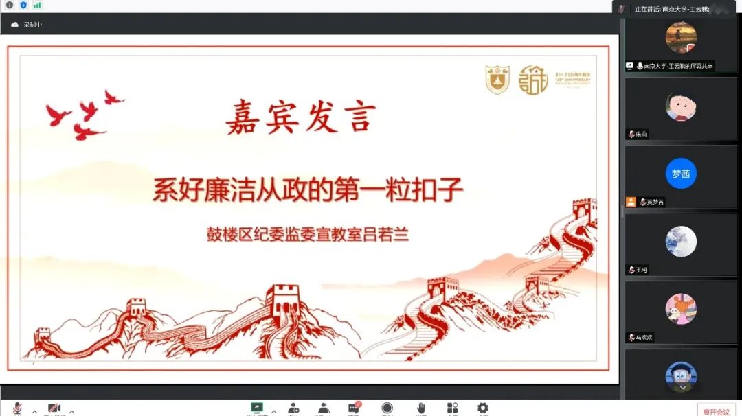 活动伊始,南京市鼓楼区纪委监委第二党支部宣传委员、宣教室干部吕若兰同志作“扣好廉洁从政的‘第一例纽扣’——‘我的廉洁观’微党课”主题分享。吕若兰同志以习近平总书记在十九届中央纪委六次全会上发表的讲话引出加强年轻干部教育管理监督工作的重要意义,并从自我腐化堕落和好友圈“围猎”两个角度切入,为大家分享了她在工作中遇到的年轻干部违纪违法的具体案例,诠释了对党忠诚和为民务实清廉精神的深切感受,使同学们对坚定理想信念,牢记初心使命,正确对待权力,时刻自重自省的内涵有了更加切实和清醒的认识。最后,吕若兰同志总结了她的廉洁观:保持清明的政治定力、务实的工作作风,练就过硬的能力本领,坚守拒腐防变的规矩底线,并勉励同志们在未来的学习和工作中一心为公,磨砺铁面无私、铁腕反腐的斗争精神;一身正气、一尘不染,成为可堪大用、能担重任的栋梁之材。