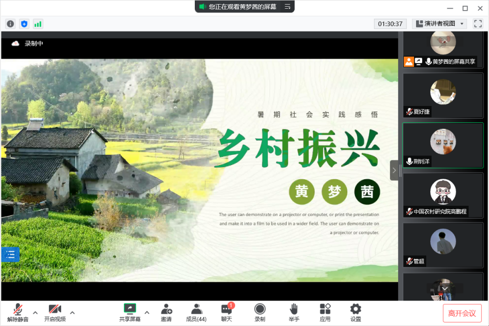 2021级硕士生第二党支部与安徽省民政厅养老服务处、中国农村调查中心(CRRC)联合开展“扬实践风采,展青年担当——2021级硕士研究生第二党支部暑期主题党日活动第3期‘乡村振兴’实践风采展示。”会议由2021级硕士生第二党支部成员荆钊洋同志主持。