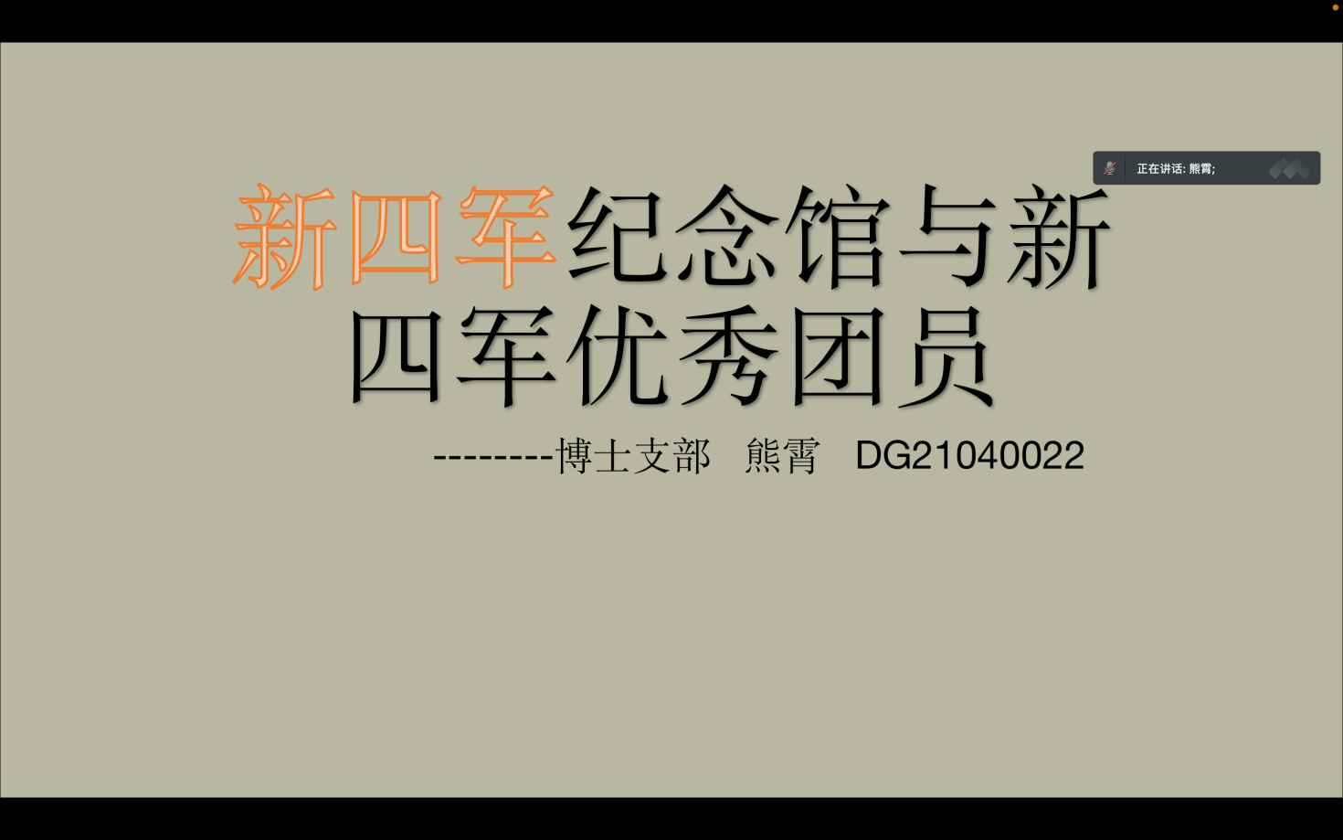 活动伊始,主持人王云鹏同学回顾了以习近平同志为核心的党中央,以伟大的历史主动精神、巨大的政治勇气、强烈的责任担当,推动党和国家事业取得的历史性成就并介绍了本次学习活动的整体流程。团课首先由2021级博士生团支部熊霄同学以“新四军纪念馆和新四军优秀团员”为主题开讲。熊霄同学将新四军纪念馆的建筑理念与新四军的发展历史娓娓道来,同时一步一景带大家了解新四军纪念馆的主馆区、新四军重建军队旧址、建军广场、大铜马等纪念馆“地标”,并依次讲述了刘少奇、袁国平、周子昆、叶挺四位优秀新四军团员的故事。熊霄同学认为虽然山川异域,时空异客,青年一代同先辈们身处不同时代,来自不同地方,但报效祖国的意念想通。这个时代,英雄的方式已不再是流血,但国家也一定且必定需要青年一代,当代青年依然可以用智慧和行动为祖国贡献青春力量。