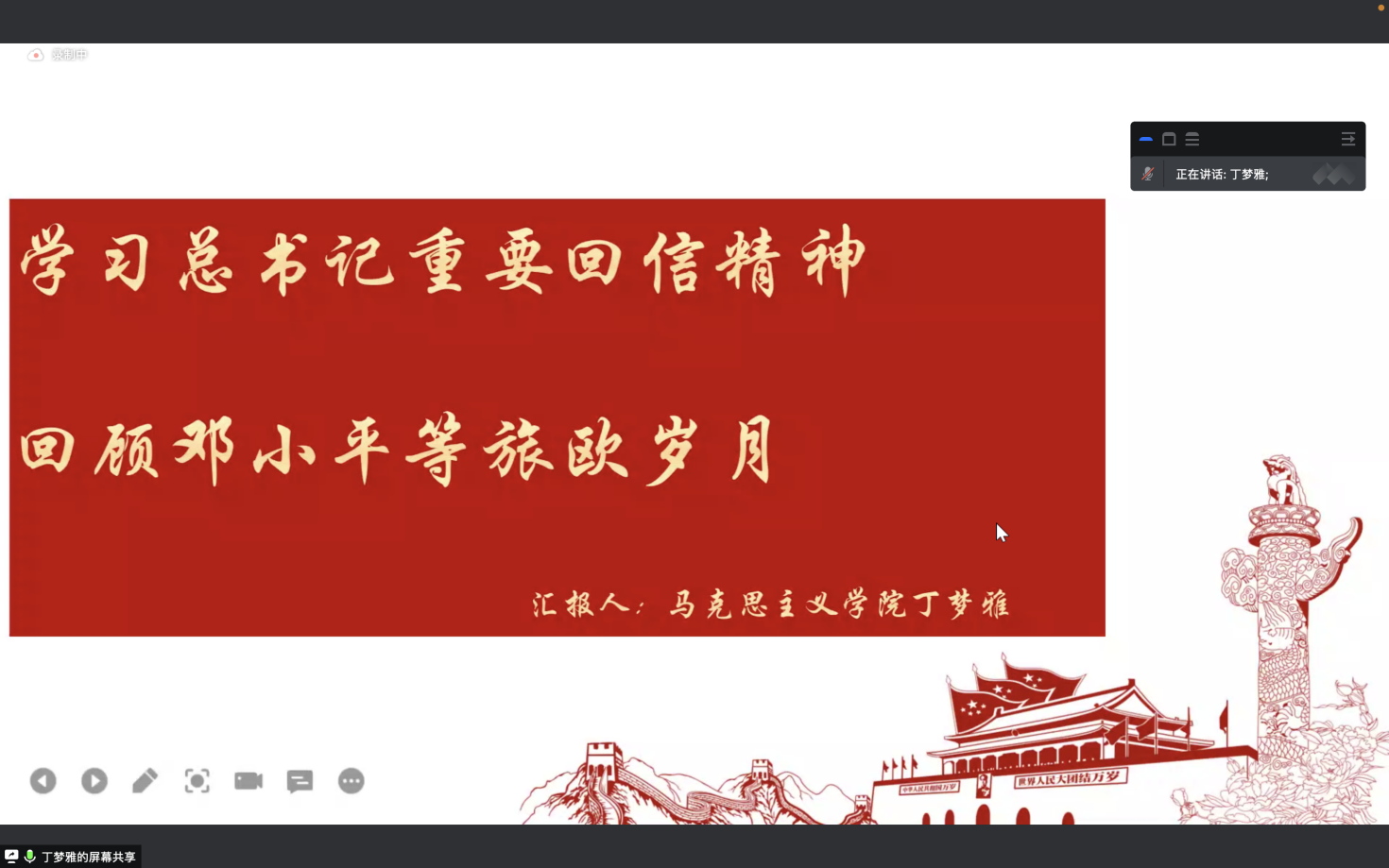 团课第二部分由2021级硕士生第一党支部丁梦雅同学作“学习总书记重要回信精神——回顾邓小平等旅欧岁月”主题分享。丁梦雅同学以习近平总书记给成人导航