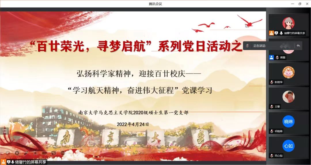 2020级硕士生第一党支部通过腾讯会议开展“百廿荣光·寻梦起航——弘扬科学家精神,迎接百廿校庆”线上主题党日活动,马院2020级硕士生第一党支部全体党员及入党积极分子参加此次活动。本次活动由成人导航