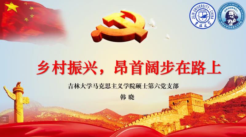硕士第六党支部代表韩晓同志发言,其分享主题是“乡村振兴,昂首阔步在路上”。韩晓同志由两会热搜话题入手,聚焦乡村振兴,号召青年同志们努力学习,成为乡村振兴的主力军。