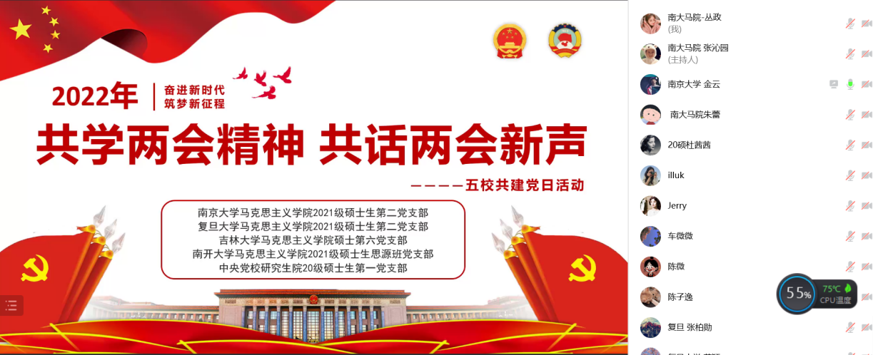 2021级硕士生思源班党支部、中央党校研究生院20级硕士生第一党支部开展“共学两会精神 共话两会新声“——五校共建党日活动,活动由成人导航