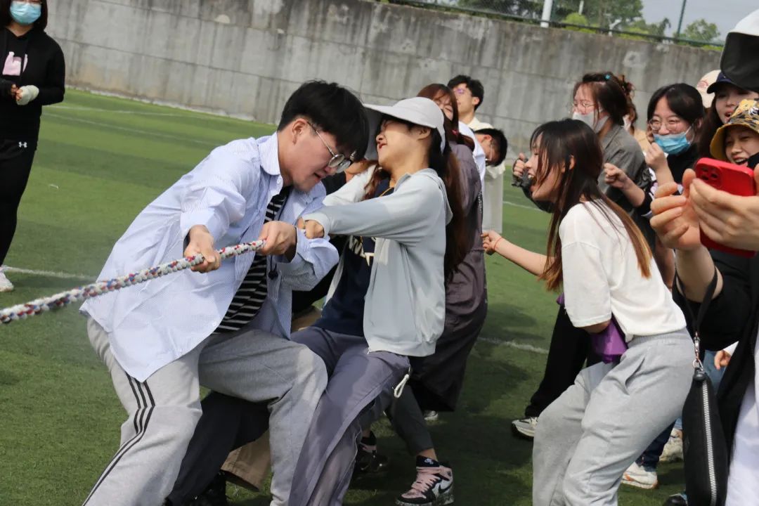 拔河比赛分预赛、半决赛和决赛三个回合。“心往一块儿想,力往一处使”是拔河制胜的关键。当比赛哨声响起,参赛队员们全力以赴,紧握长绳、卯足了劲向后拉去。一时间加油声、叹息声、欢呼声此起彼伏。老师们也纷纷呐喊助威,在一句句呐喊声中,老师和同学们的感情也在逐步升温。