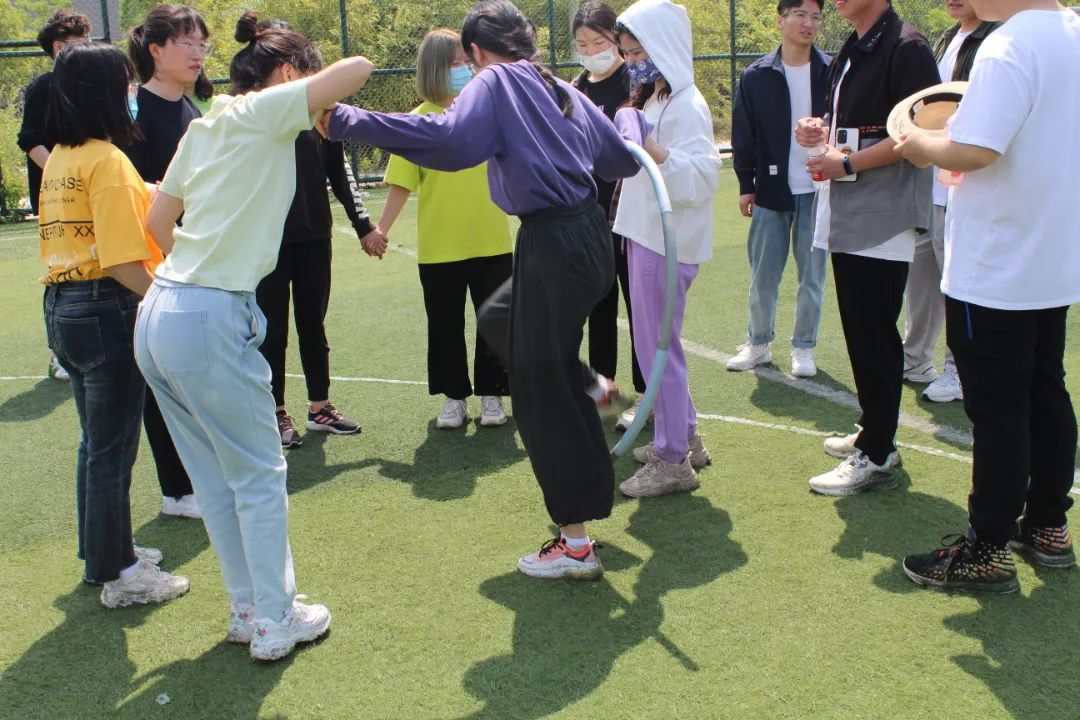 8名参赛队员手拉手围成一圈,用呼啦圈穿过所有人身体三圈后回到原位,整个过程不能讲话,仅仅靠着肢体和眼神沟通完成比赛,这考验着大家的默契与灵活度。在比赛练习阶段,不少队伍迅速磨合并找到了游戏诀窍,比赛用时极短,均取得了不错的成绩。