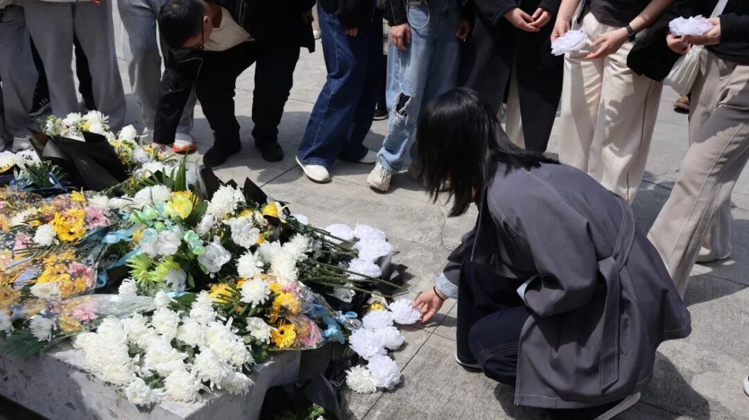 参观结束后,全体师生来到烈士纪念碑前举行凭吊仪式。在庄严的《中华人民共和国国歌》的歌声中,仪式拉开序幕。随后,全体师生面向纪念碑集体三鞠躬,表达对英烈的深切缅怀。教师代表上前整理挽带,同学们也依次上前,将先前手工制作的小白花敬献于纪念碑前,以寄哀思,以悼忠魂。全体师生缓步环绕纪念碑一周,完成凭吊仪式,深切告慰长眠于此的航空英烈。