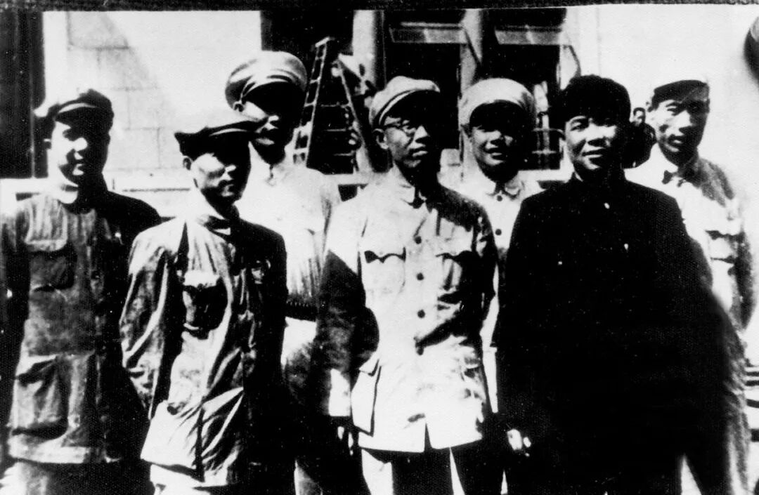 解放初期的杭州市领导人(左起:李丰平、林枫、王芳、吴宪、姚力、江华、傅展如)