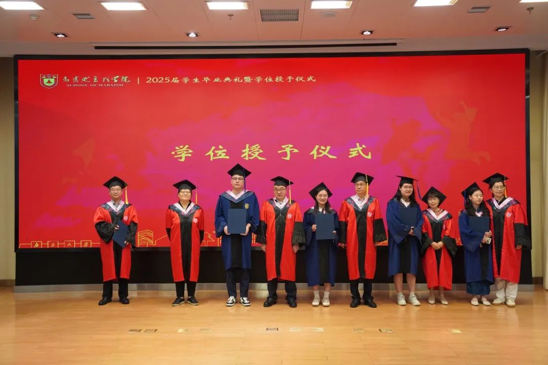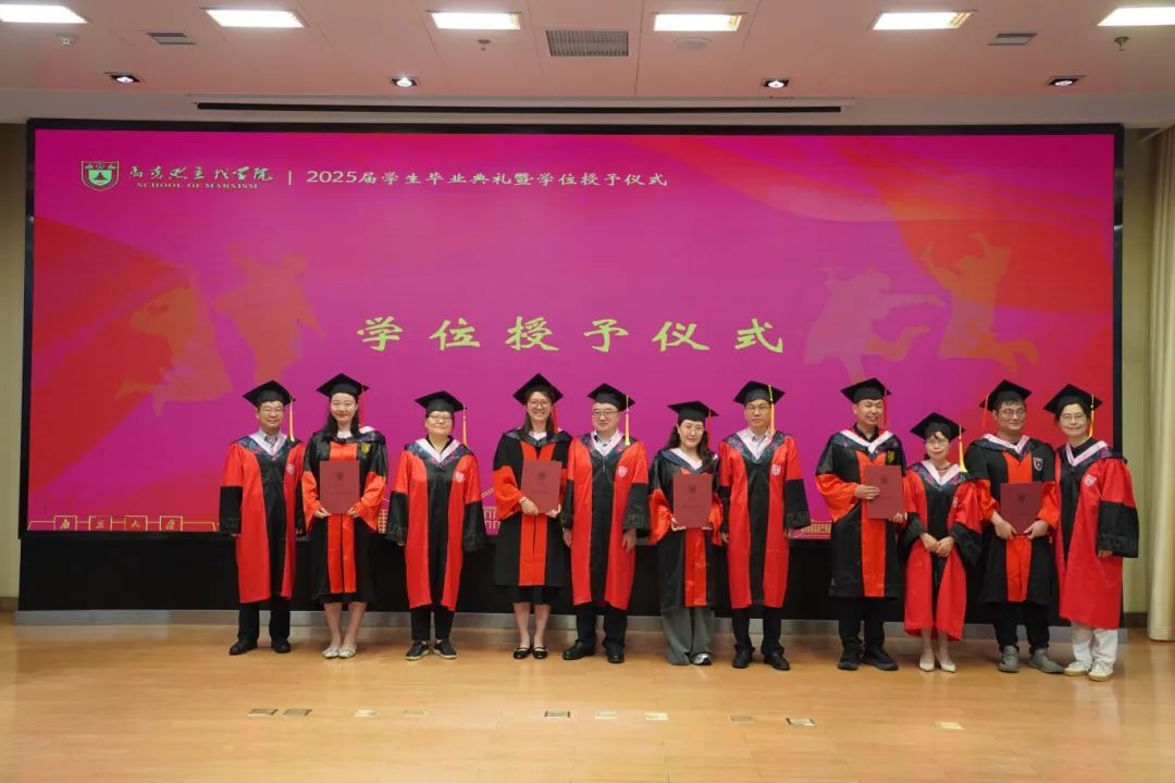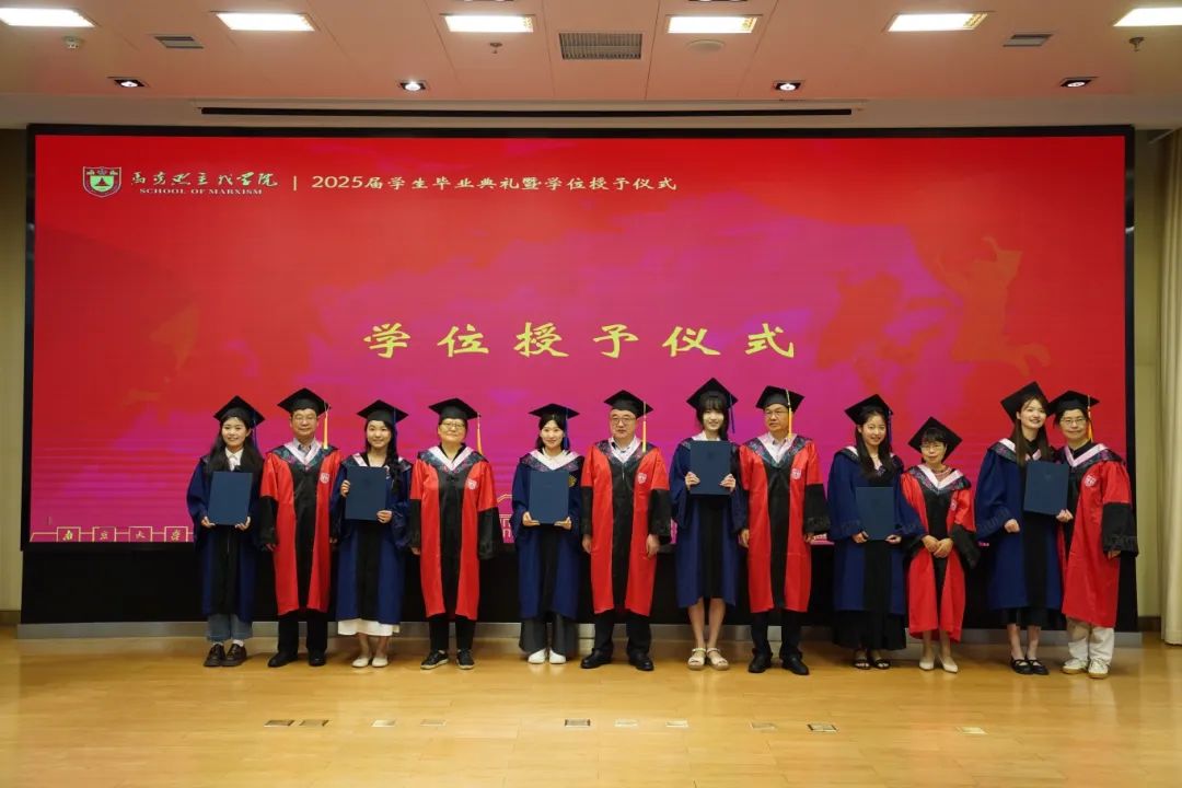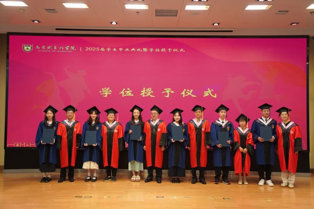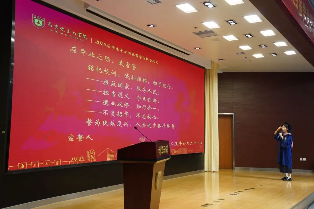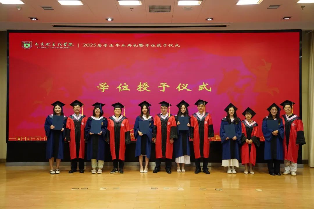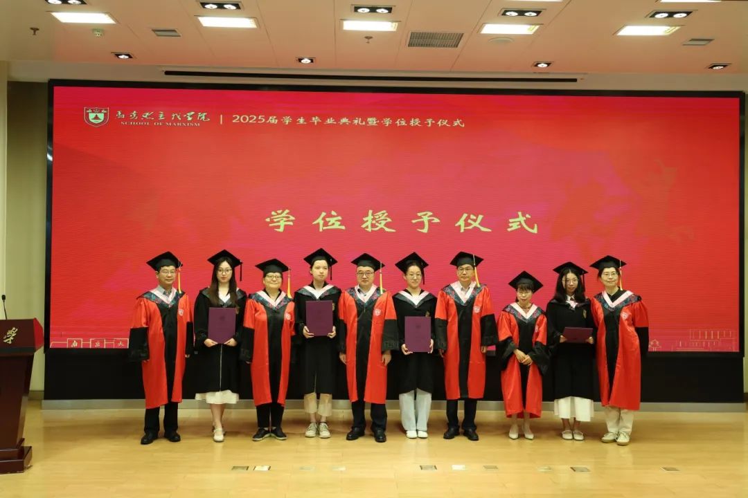 马克思主义学院2025届学生毕业典礼暨学位授予仪式在杜厦图书馆报告厅成功举办。学院党委书记时昱老师、院长王建华老师,副院长吴翠丽老师、倪春纳老师、李乾坤老师,学院学位评定分委员会委员王明生老师、戴雪红老师、熊秋良老师、暴庆刚老师,青年教师代表王楠老师、周瑞瑞老师,辅导员刘晶月老师出席典礼。典礼由学院党委副书记夏娟老师主持。