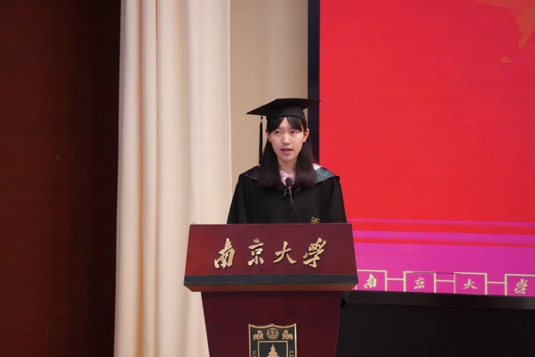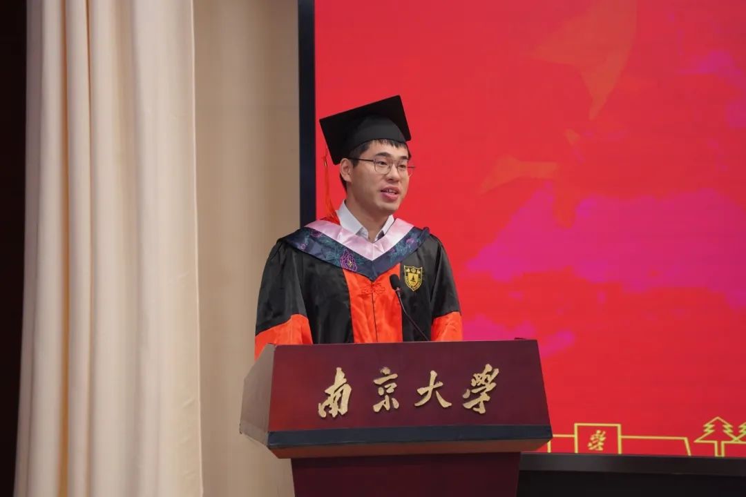 博士毕业生代表范佛山同学则用“感想”“感谢”“感悟”三个关键词,回顾了七年南大时光。在谈及感想时,他回忆了可敬师长的托举、可喜的学院发展与可爱的南马学子;在表达感谢时,他感谢恩师王建华教授的学业指导与生活关怀,感谢同窗陪伴与家人支持。最后,范佛山分享自己的感悟。他认为,立志当立长志,并终其一生为之奋斗;在前行的道路上,既要以“静”积蓄力量,也要以“争”争取价值;而面对离别,则应将不舍化作动力,以进步酬报这段难忘的时光。