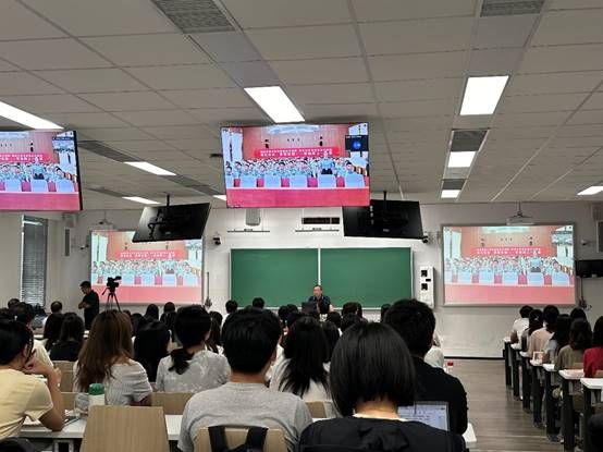 沈伯平教授重点讲解抗战阅兵的背景,同时结合毛泽东的《论持久战》论述如何打好新时代中国高水平科技自立自强这一“硬仗”并以此弘扬伟大抗战精神。他结合习近平总书记论中国梦的三句话:中华民族的昨天,“雄关漫道真如铁”;中华民族的今天,“人间正道是沧桑”;中华民族的明天,“长风破浪会有时”,讲解当代大学生在强国建设和民族复兴伟业的担当与责任。最后沈伯平教授勉励新时代大学生“心中有理想、眼中有光芒、脚下有力量”,要以“踏石留印、抓铁有痕”的求真务实精神,实现习近平总书记在9·3阅兵式讲话中提出的“中华民族伟大复兴势不可挡!人类和平与发展的崇高事业必将胜利!”的伟大奋斗目标。全课程在双方学生的热烈掌声中结束。