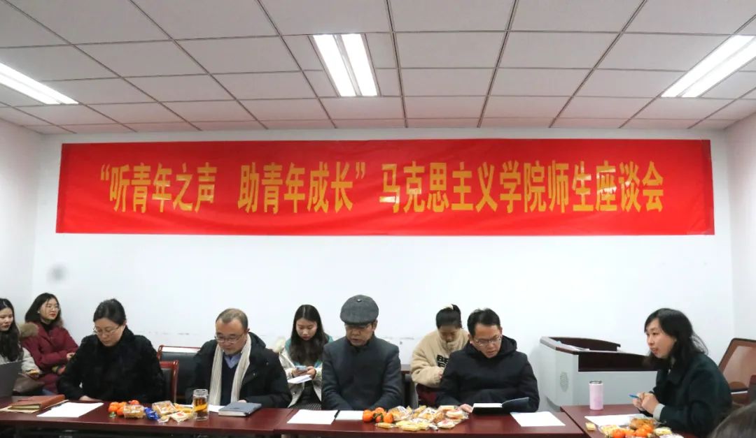 师生代表欢聚一堂,举办以“听青年之声、助青年成长”为主题的师生座谈会。学院党委书记王建华老师、院长胡大平老师、副院长陈建老师、党委副书记时昱老师、团委书记刘晶月老师以及来自