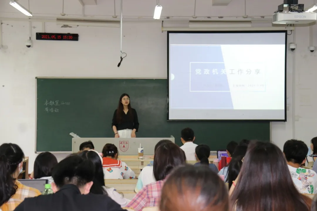 随后,就职于中共南通市委党史办的黄雨蓓学姐从自己的工作经历出发,为同学们带来工作经验和报考经验分享。在工作体验方面,学姐从三个角度介绍了自己的感悟,认为要及时注意学生和职场人员角色的转换,细节决定成败,语言的艺术和组织活动的艺术都非常重要。学姐强调公文写作是体制内生存必备技能。关于求职准备,学姐认为首先要搜集信息,越早了解就能越早构建起职业认知;其次要积极参与校内校外的实习实践;要提前准备好论文素材,在保证学业的情况下求职。关于选调生备考指南,学姐从报考信息获取、选调流程、备考须知、笔试准备、面试准备五个角度,为大家详细讲解了如何备考,帮助在场的同学们树立起求职自信心。