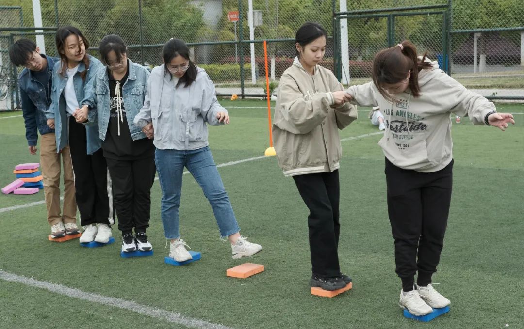 呼啦圈过山车项目一直深受同学们的喜爱,本次运动会新增“蒙眼”难度。面对“天黑”模式,同学们不但毫不畏惧,反而跃跃欲试。手拉手,心连心,传递的不是呼啦圈,而是对彼此的珍重与信任。2021级硕士一班与二班的传递用时仅差2秒,2021级硕士一班险胜一筹。