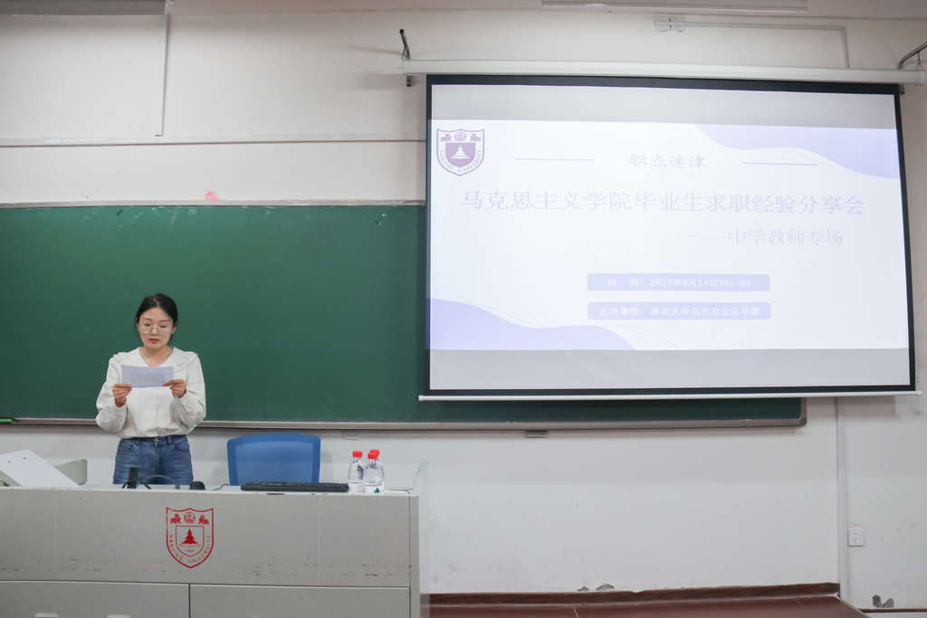2020级马克思主义基本原理专业的何鑫乐学长及思想政治教育专业的徐金婷学姐进行分享,会议由董梦圆同学主持。两位学长学姐从招考条件、信息获取、择校考量及笔面试准备等方面,对中学教师招聘进行多维分析,向参会同学传授求职经验。在结构化面试模拟环节,两位学长学姐通过一对一面试辅导的方式,在实战演习中传授面试技巧。