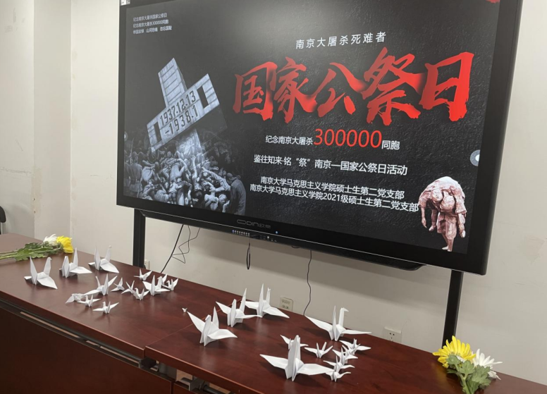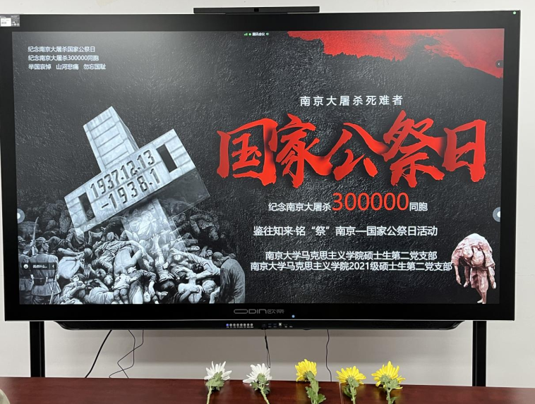 活动伊始,伴随着庄严低回的哀乐,支部成员手持菊花,颔首肃立,为南京大屠杀死难同胞默哀。