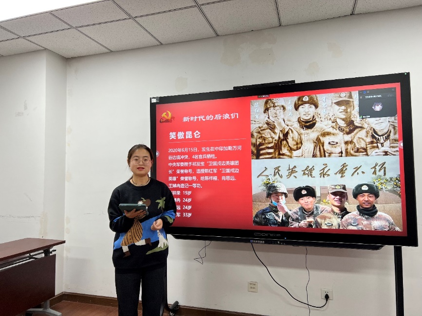 主讲人沙小梅从“新时代的后浪”引入,讲述了2020年6月15日在中印冲突里壮烈牺牲的4名中国官兵的故事:陈祥榕“清澈的爱只为中国”的战斗口号体现了后浪的英雄气概;肖思远“党叫干啥就干啥”的作战日记展现了后浪的赤胆忠诚;王焯冉“来生好好报答父母”的家书道出了后浪舍小家顾大家的赤子情怀;陈红军“决不把主权守丢了”的书评刻画了后浪的英勇无畏。