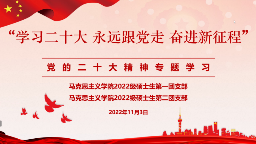 2022级硕士生第一团支部、2022级硕士生第二团支部开展“学习二十大 永远跟党走 奋进新征程”党的二十大精神专题学习活动。本次活动采用线上形式,由2022级硕士生第一团支部书记邵嘉曌主持,成人导航
