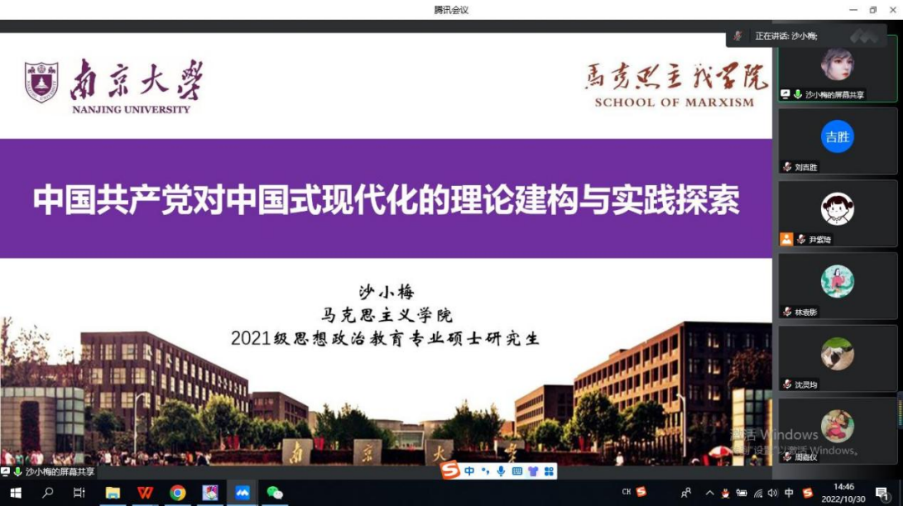 在共同学习环节,尹紫琦围绕“二十大报告中的新提法”进行解读,向大家介绍了二十大报告中的“三件大事”:一是迎来中国共产党成立一百周年,二是中国特色社会主义进入新时代,三是完成脱贫攻坚、全面建成小康社会的历史任务,实现第一个百年奋斗目标。首先,她播放了中国共产党国际形象网络宣传片,回顾了党的奋斗历程。其次,她引用《井冈山的斗争》中毛泽东的话语来表达我们最终走向胜利的艰辛。随后,在带领大家学习了中国特色社会主义进入新时代的内涵和全面建成小康社会的实践过程后,她号召支部全体同志踔厉奋发、勇毅前行、顽强拼搏、艰苦奋斗,努力做中国特色社会主义事业的建设者和接班人。