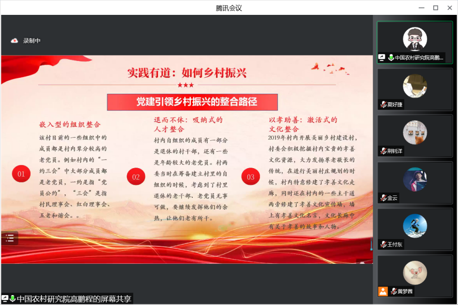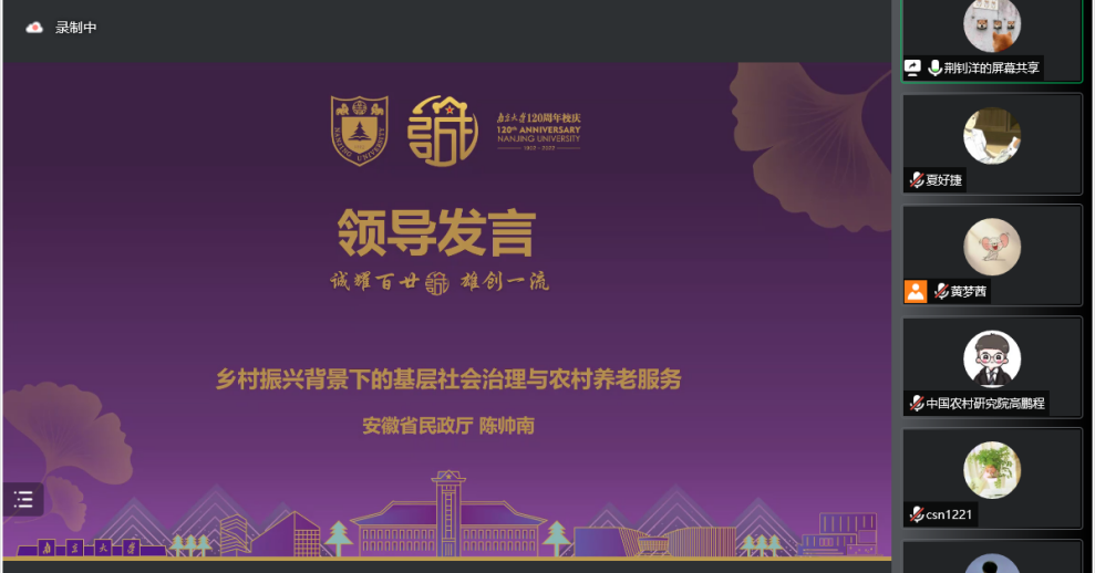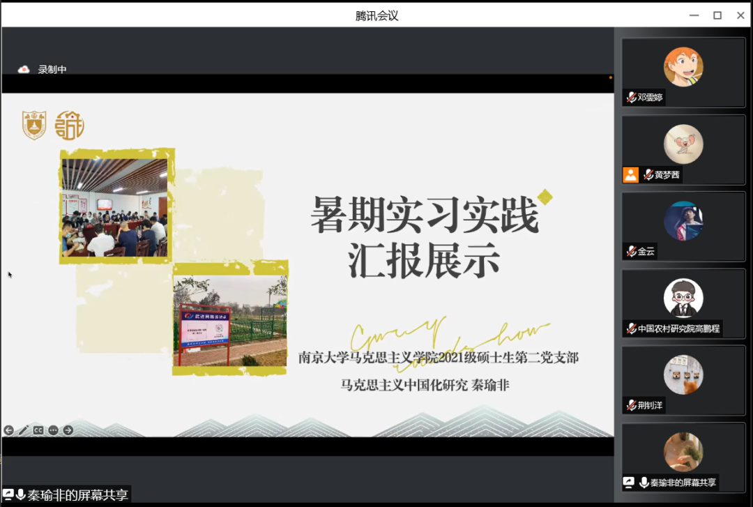 2021级硕士生第二党支部与安徽省民政厅养老服务处、中国农村调查中心(CRRC)联合开展“扬实践风采,展青年担当——2021级硕士研究生第二党支部暑期主题党日活动第3期‘乡村振兴’实践风采展示。”会议由2021级硕士生第二党支部成员荆钊洋同志主持。