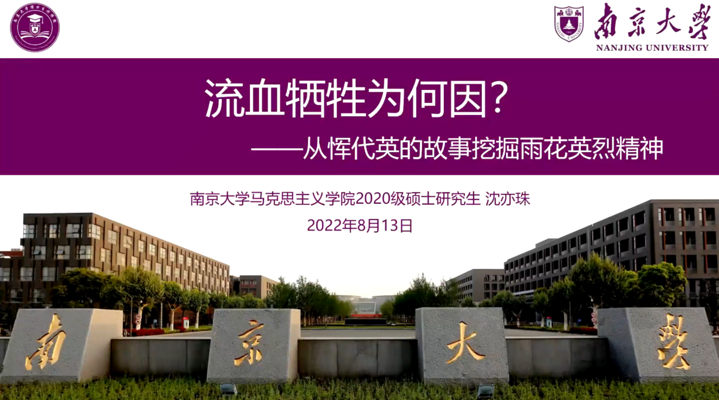 团课第四部分由2020级硕士生第二团支部张素雯同学作“雨花英烈精神——以信仰和忠诚照亮未来之路”主题分享。张素雯同学通过侯绍裘、张炽、谢文锦、恽代英纸短情长的尺素书信,郭纲琳、冷少农公而忘私,国而忘家的动人故事以及谢士炎、朱克靖、史砚芬慨当以慷的诗词片语,讲述在风雨飘摇的革命年代,为谋求民族独立和人民解放的无数志士仁人血洒雨花台的英勇故事,展现了雨花英烈们崇高的理想信念、高尚的道德情操和为民牺牲的大无畏精神。