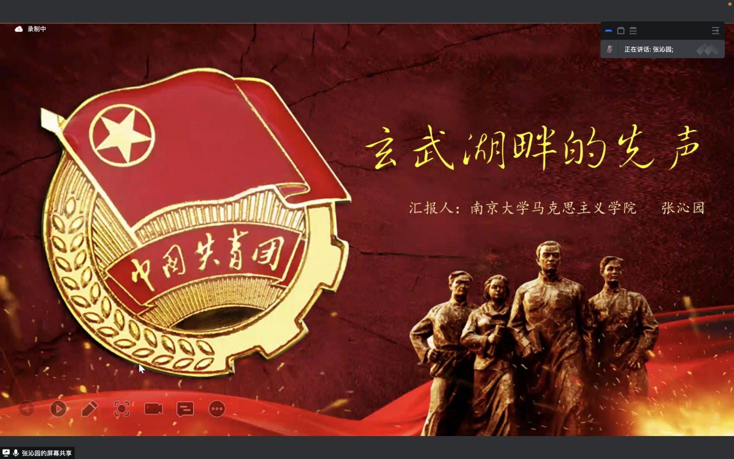 团课第五部分由2021级硕士生第二团支部张沁园同学作“玄武湖畔的先声”主题分享。张沁园同学讲述了社会主义青年团诞生历程,同时以贺瑞麟烈士的《死前日记》为切入点,并结合谢远定、宛希俨、文化震三位革命先辈向死而生的光荣事迹勾勒出那一代人走出书斋,走入社会,为共产主义理想信念呼号奔走的故事,展现了革命先辈对革命,对未来,对信仰的追寻与向往。