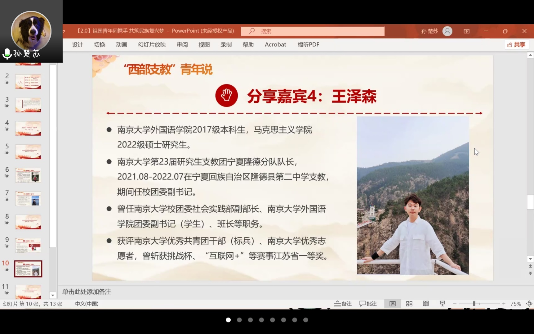 第23届研究生支教团宁夏隆德分队开展支教活动,他从“教学一线立德树人”、“五育并举融合育人”、“捐资助学励志启人”、“影响广泛成果喜人”四个方面分享自己的支教经历,在支教活动中阅社情、知国情,长见识、增才干,为祖国西部发展贡献自己的青年力量。