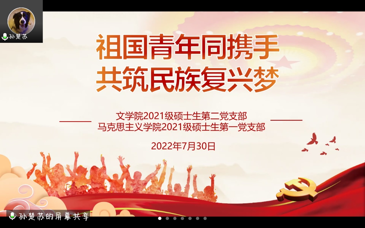 2021级硕士生第一党支部联合文学院2021级硕士生第二党支部于2022年7月30日晚七点共同开展“祖国青年同携手,共筑民族复兴梦”主题党日活动。通过讲述青年奋斗故事,展现青年理想担当,激励青年扎根祖国大地,为实现民族复兴梦而不懈奋斗。本次党日活动由 成人导航