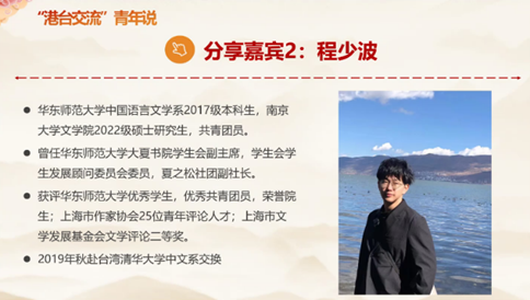 文学院2022级硕士研究生程少波曾于2019年秋赴台湾清华大学中文系交换,虽然台湾的基础设施及学术研究与大陆存在一定差距,但他仍能真切感受到当前绝大部分台湾青年对大陆文化的殷切期待,对两岸团结统一的认可与支持,相信两岸青年能够进一步加强沟通与理解,共筑祖国美好未来。