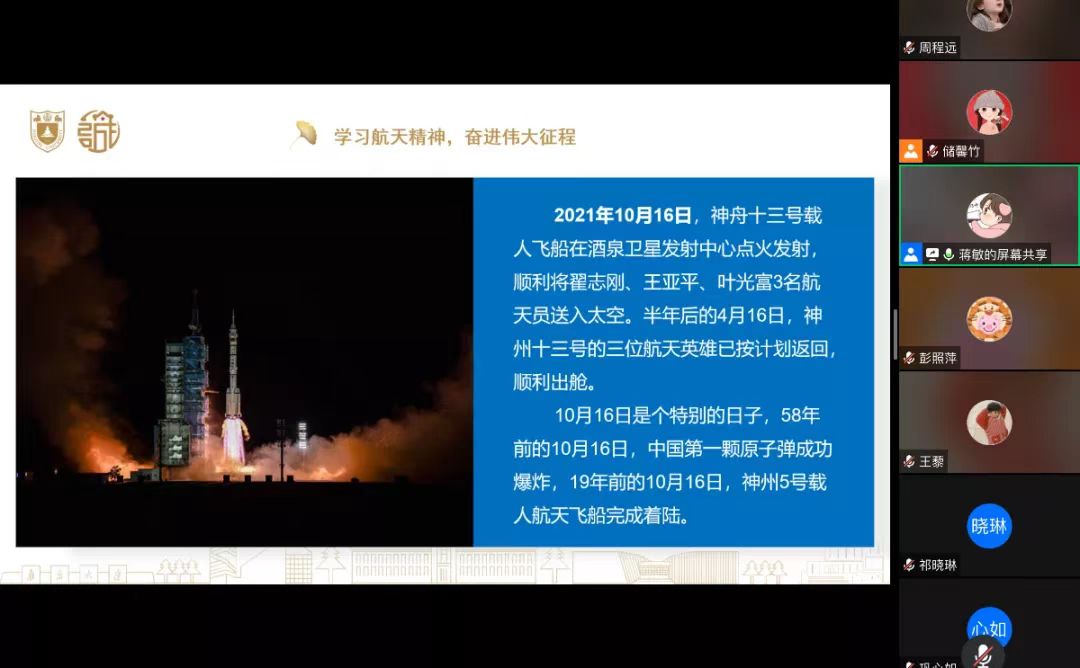 紧接着,蒋敏同志向大家讲述了航天路上的南大人,从20世纪50年代中期到21世纪的今天,从朱光亚、任新民、程开甲、赵九章等老一辈南大航天工作者到如今新一批南大人依然活跃在建设航天强国的战场上,从“东方红一号”卫星、第一颗原子弹成功爆炸到“龙虾眼X射线探测卫星”、首颗太阳探测科学技术试验卫星“羲和号”在太原卫星发射中心成功发射升空等航天事件均有南大人努力奋斗的身影。他们满怀建设新中国的赤诚之心,将青春年华奉献给国防科学事业。