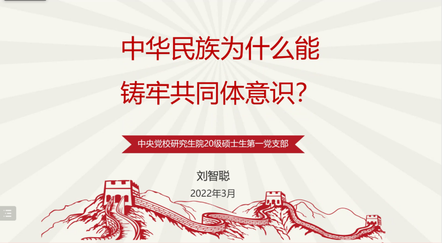 最后是中央党校研究生院20级硕士生第一党支部代表刘智聪同志发言,他的发言围绕“中华民族为什么能铸牢共同体意识”展开。刘智聪同志从政治、经济、文化多个角度论证“共同体意识”的必然性,“两会”本身即中华民族团结与共的象征。
