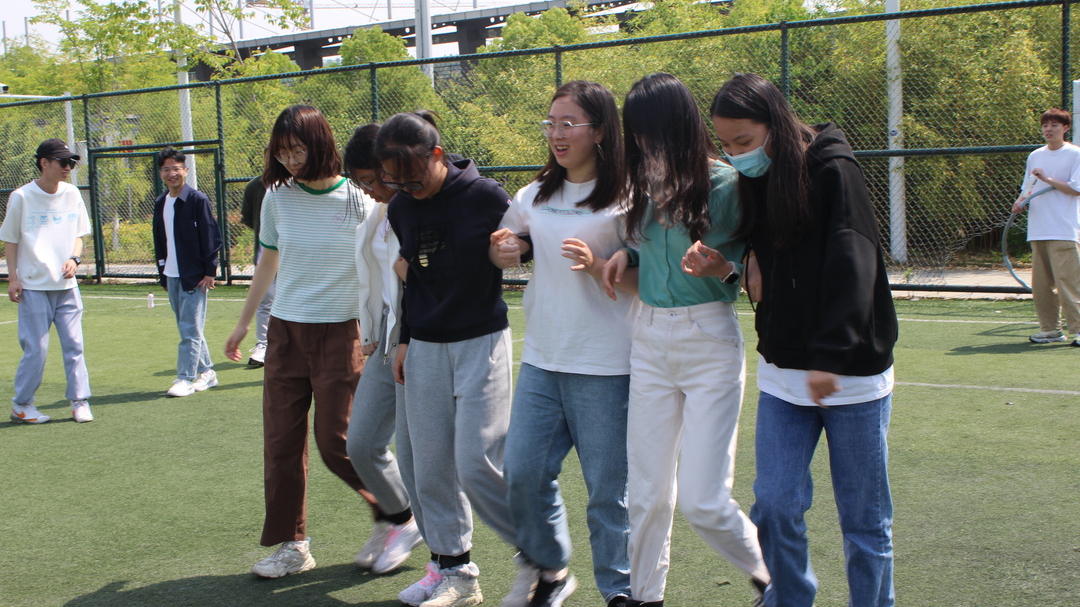 8名参赛队员手拉手围成一圈,用呼啦圈穿过所有人身体三圈后回到原位,整个过程不能讲话,仅仅靠着肢体和眼神沟通完成比赛,这考验着大家的默契与灵活度。在比赛练习阶段,不少队伍迅速磨合并找到了游戏诀窍,比赛用时极短,均取得了不错的成绩。