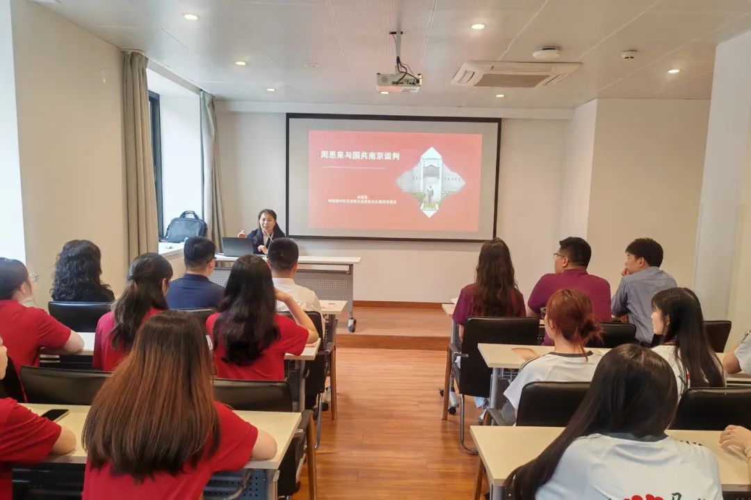 随后,梅园新村纪念馆综合业务部主任林建英老师带来主题微党课《周恩来与国共南京谈判》。她深情讲述了周恩来率领的中共代表团在此以大无畏精神和卓越智慧,同坚持独裁、内战的国民党当局展开有理、有利、有节的斗争,最大程度推迟了全面内战爆发,历史意义深远。